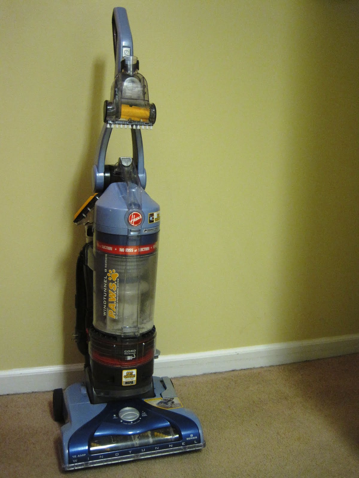 What was difficult was deciding whether to buy a regular model or spring for a Dyson Animal (the Holy Grail of vacuums). After reading a LOT of reviews and talking to friends and family, I bought a Hoover Wind Tunnel Pet Rewind. It seemed comparable to the Dyson for less than half the price (and believe it or not, there are some bad reviews out there for the Dyson). After one use, I’m VERY pleased with the Hoover. The carpet looks great – I had to empty the container twice, which I took as a good (if yucky) sign. All the attachments are conveniently mounted on the vacuum, so I can sweep over the couches as I go by. But it took a long time to vacuum because I had to stop and adjust the floor settings a lot. And change outlets a lot, because the cord is kind of short (but it automatically retracts!). We’ll see how it does over time, but I’m happy with my purchase.